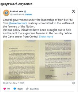 ಕೇಂದ್ರ ಸರ್ಕಾರ ಕಬ್ಬು ಬೆಳೆಗಾರರ ಹಿತ ಕಾಯಲು ಬದ್ಧವಾಗಿದೆ ಎಂದು ಕೇಂದ್ರ ಸಚಿವ ಪ್ರಲ್ಹಾದ್ ಜೋಶಿ ಹೇಳಿದ್ದಾರೆ. ಪ್ರಧಾನಿ ಮೋದಿ ಅವಧಿಯಲ್ಲಿ FRP ಹೆಚ್ಚಳ, ಎಥೆನಾಲ್ ಉತ್ಪಾದನೆಗೆ ಉತ್ತೇಜನ ಹಾಗೂ ಸಕ್ಕರೆ ರಫ್ತಿನಿಂದ ರೈತರಿಗೆ ಲಾಭವಾಗಿದೆ ಎಂಬುದನ್ನು ಒತ್ತಿಹೇಳಿದ ಅವರು, ಕರ್ನಾಟಕ ಸಿಎಂ ಸಿದ್ದರಾಮಯ್ಯ ಆರೋಪಕ್ಕೆ ದಾಖಲೆಗಳ ಸಮೇತ ಉತ್ತರ ನೀಡಿದ್ದಾರೆ.