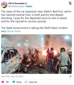 ಕಾರು ಸ್ಪೋಟ ಘಟನೆ ಬಗ್ಗೆ ಬೇಸರ ವ್ಯಕ್ತಪಡಿಸಿ ಸಿಎಂ ಸಿದ್ದರಾಮಯ್ಯ ತಮ್ಮ ಎಕ್ಸ್ ಖಾತೆಯಲ್ಲಿ ಪೋಸ್ಟ್ ಮಾಡಿದ್ದಾರೆ. ಹಲವರು ಸಾವಿಗೀಡಾದ ಸುದ್ದಿ ನೋವಿನ ಜೊತೆಗೆ ದಿಗ್ಭ್ರಮೆ ಉಂಟುಮಾಡಿದೆ. ಮೃತರ ಆತ್ಮಕ್ಕೆ ಚಿರಶಾಂತಿ ಸಿಗಲಿ, ಗಾಯಾಳುಗಳು ಶೀಘ್ರ ಗುಣಮುಖರಾಗಲಿ ಎಂದು ಹಾರೈಸುತ್ತೇನೆ ಎಂದಿದ್ದಾರೆ. ಅಲ್ಲದೆ, ದೆಹಲಿಯ ಸ್ಪೋಟ ಪ್ರಕರಣವನ್ನು ರಾಜ್ಯ ಸರ್ಕಾರವು ಅತ್ಯಂತ ಗಂಭೀರವಾಗಿ ಪರಿಗಣಿಸಿದ್ದು, ರಾಜ್ಯ ರಾಜಧಾನಿ ಬೆಂಗಳೂರು ಸೇರಿದಂತೆ ಎಲ್ಲಾ ಜಿಲ್ಲಾ ಕೇಂದ್ರಗಳಲ್ಲಿ ತೀವ್ರ ಕಟ್ಟೆಚ್ಚರ ವಹಿಸುವಂತೆ ಪೊಲೀಸ್ ಮಹಾನಿರ್ದೇಶಕರಿಗೆ ಸೂಚನೆ ನೀಡಿದ್ದೇನೆ. ಜನನಿಬಿಡ ಸ್ಥಳಗಳಲ್ಲಿ ಭದ್ರತೆಯನ್ನು ಹೆಚ್ಚಿಸಿ, ಜನರ ಸುರಕ್ಷತೆಗೆ ಆದ್ಯತೆ ನೀಡುವಂತೆ ಗೃಹ ಇಲಾಖೆಗೆ ಸೂಚನೆ ನೀಡಲಾಗಿದೆ. ರಾಜ್ಯದಲ್ಲಿ ಯಾವುದೇ ತರನಾದ ಅಹಿತಕರ ಘಟನೆಗಳು ನಡೆಯದಂತೆ ಮುನ್ನೆಚ್ಚರಿಕಾ ಕ್ರಮಗಳನ್ನು ಕೈಗೊಳ್ಳಲಾಗುತ್ತಿದ್ದು, ಸಾರ್ವಜನಿಕರು ಕೂಡ ಪೊಲೀಸ್ ಇಲಾಖೆಯ ಜೊತೆ ಸಹಕರಿಸಬೇಕು ಎಂದು ಸಿಎಂ ಮನವಿ ಮಾಡಿದ್ದಾರೆ.