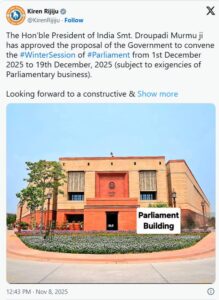 ರಾಷ್ಟ್ರಪತಿ ಶ್ರೀಮತಿ ದ್ರೌಪದಿ ಮುರ್ಮು ಅವರು ಡಿಸೆಂಬರ್ 1ರಿಂದ ಡಿಸೆಂಬರ್ 19 ರವರೆಗೆ ಸಂಸತ್ತಿನ ಚಳಿಗಾಲದ ಅಧಿವೇಶನವನ್ನು ಕರೆಯುವ ಸರ್ಕಾರದ ಪ್ರಸ್ತಾಪವನ್ನು ಅನುಮೋದಿಸಿದ್ದಾರೆ ಎಂದು ಅವರು ಪೋಸ್ಟ್ ಮಾಡಿದ್ದಾರೆ. ನಮ್ಮ ಪ್ರಜಾಪ್ರಭುತ್ವವನ್ನು ಬಲಪಡಿಸುವ ಮತ್ತು ಜನರ ಆಕಾಂಕ್ಷೆಗಳನ್ನು ಪೂರೈಸುವ ರಚನಾತ್ಮಕ ಮತ್ತು ಅರ್ಥಪೂರ್ಣ ಅಧಿವೇಶನವನ್ನು ಎದುರು ನೋಡುತ್ತಿದ್ದೇನೆ ಎಂದು ಬರೆದುಕೊಂಡಿದ್ದಾರೆ.